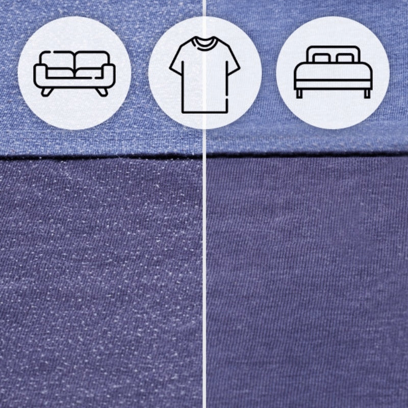 zmechacony materiał zmienia się w gładką, odświeżoną tkaninę. Golarka skutecznie usuwa kuleczki, kłaczki i zmechacenia, przywracając ubraniom i tapicerce nowy wygląd