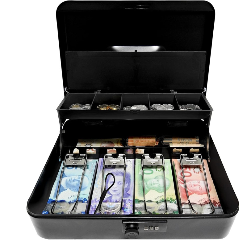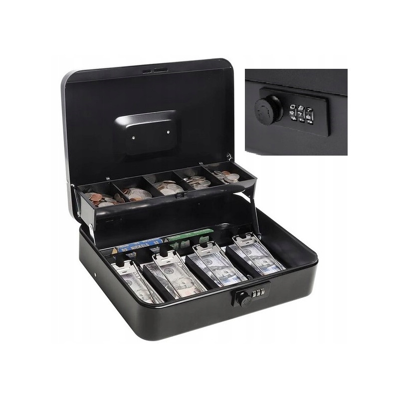 - Wysokie Bezpieczeństwo: Kasetka wyposażona w solidny zamek cyfrowy, który zabezpiecza zawartość. Podajesz kod odpowiednim osobom i tylko one mają dostęp do pieniędzy.
