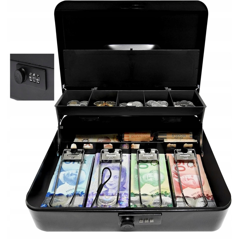 - Praktyczne Wnętrze: Kasetka posiada przemyślaną organizację wnętrza z 5 przegródkami na monety oraz 4 przegrodami z klipsami sprężynowymi na banknoty, co umożliwia łatwe sortowanie i dostęp do gotówki.