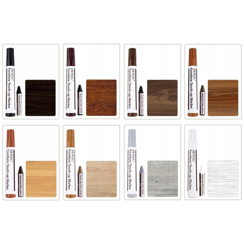 - Szeroka gama kolorów: W zestawie znajdziesz 8 różnych kolorów markerów i wosków: Czarny, Szary, Biały, Mahoń, Klon, Dąb, Wiśnia i Orzech Włoski. Tak szeroki wybór pozwala na idealne dopasowanie do praktycznie każdego rodzaju i odcienia drewna, co zapewnia naturalny i spójny efekt naprawy.