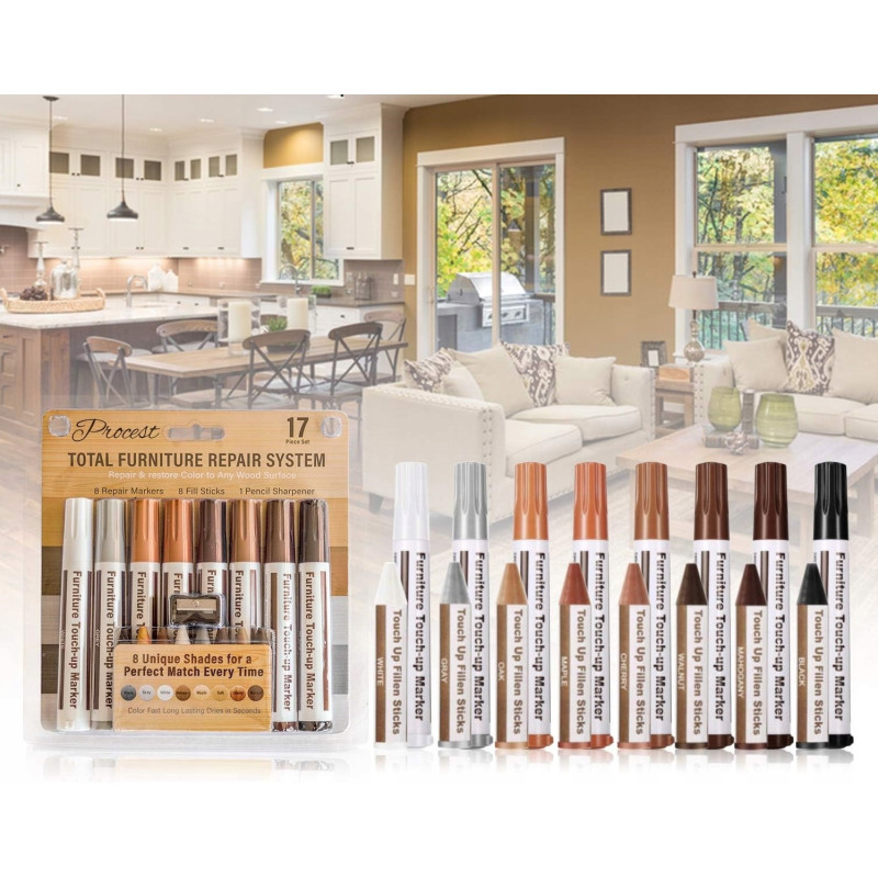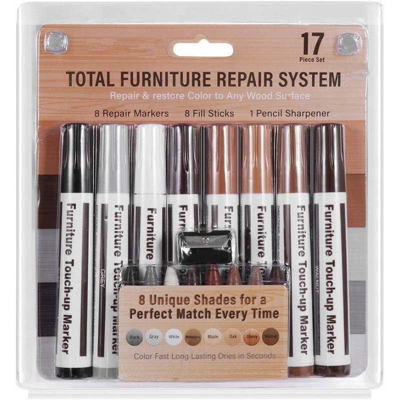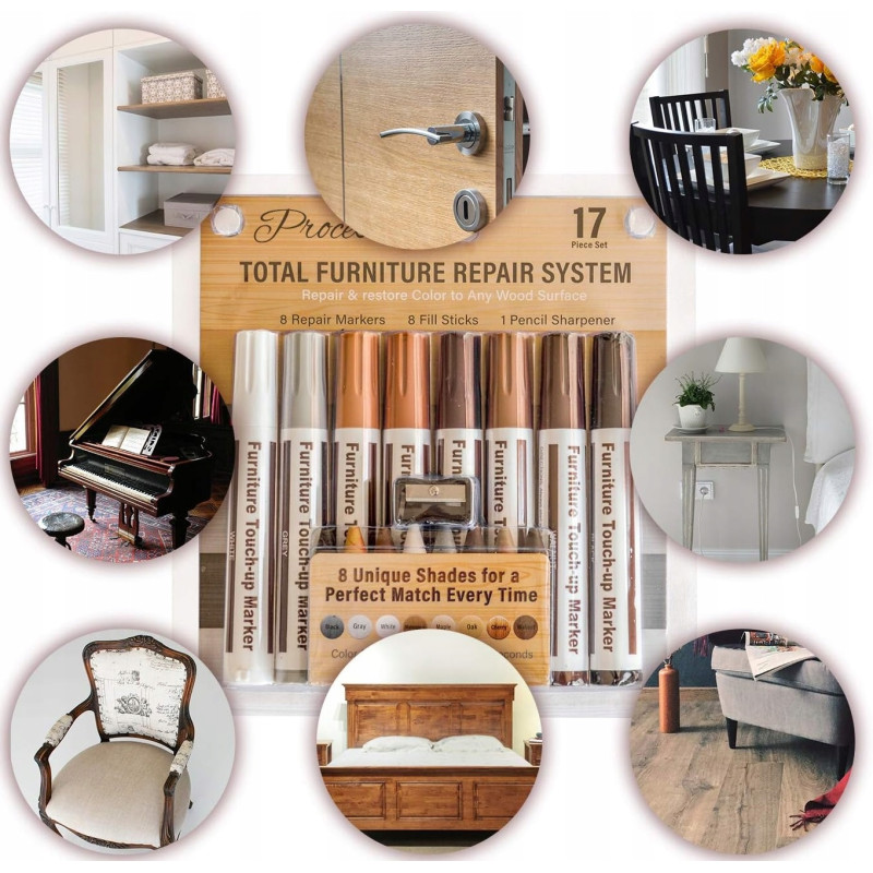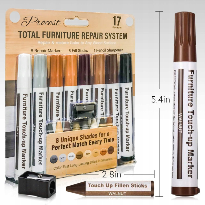 Dzięki naszemu zaawansowanemu zestawowi do naprawy mebli, naprawa zarysowań i ubytków w drewnianych powierzchniach jest teraz prostsza niż kiedykolwiek. Niezależnie od tego, czy chcesz odświeżyć wygląd swojego salonu, naprawić uszkodzone drzwi czy przywrócić świetność starym meblom, ten zestaw jest idealnym rozwiązaniem dla Ciebie. W zestawie znajdziesz 8 markerów w różnych kolorach, 8 woskowych wypełniaczy oraz temperówkę, które razem umożliwiają kompleksową naprawę i przywrócenie naturalnego wyglądu drewnianych powierzchni.