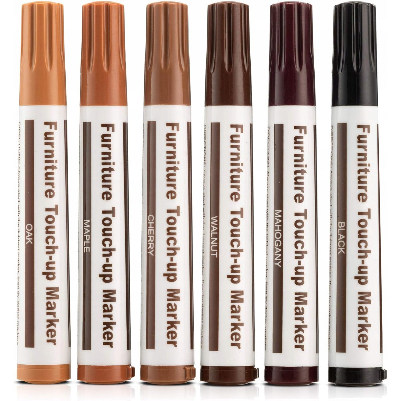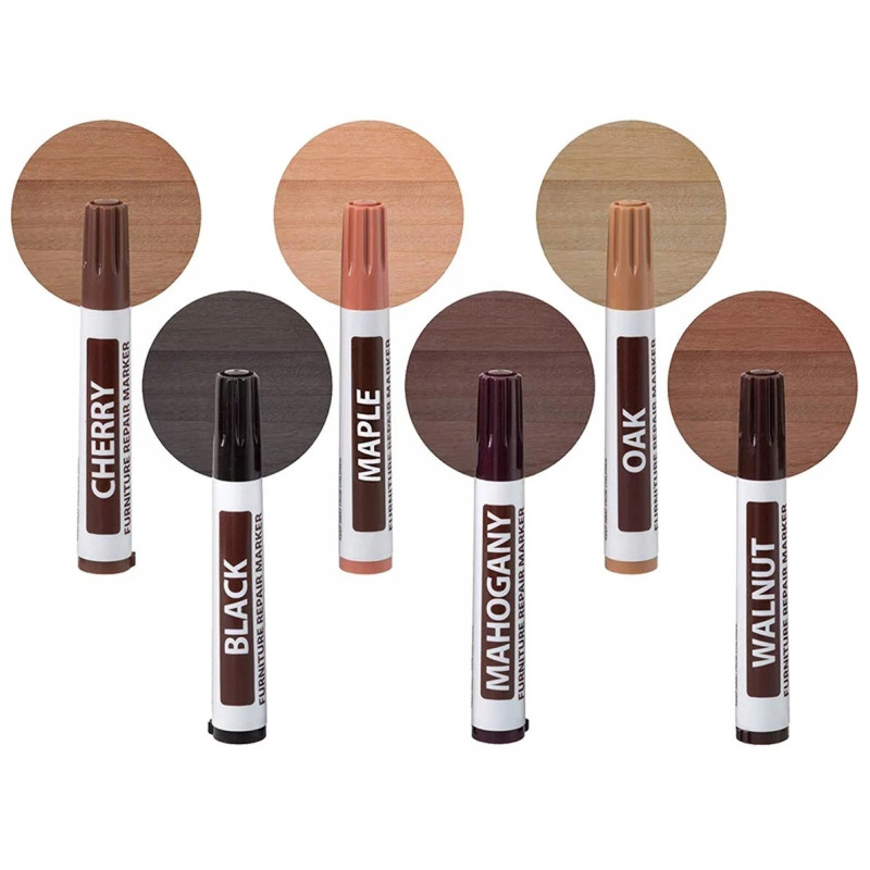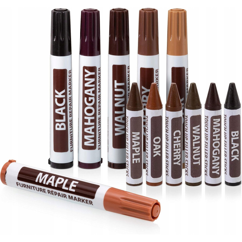 - Szeroka gama kolorów: W zestawie znajdziesz 8 różnych kolorów markerów i wosków: Czarny, Szary, Biały, Mahoń, Klon, Dąb, Wiśnia i Orzech Włoski. Tak szeroki wybór pozwala na idealne dopasowanie do praktycznie każdego rodzaju i odcienia drewna, co zapewnia naturalny i spójny efekt naprawy.