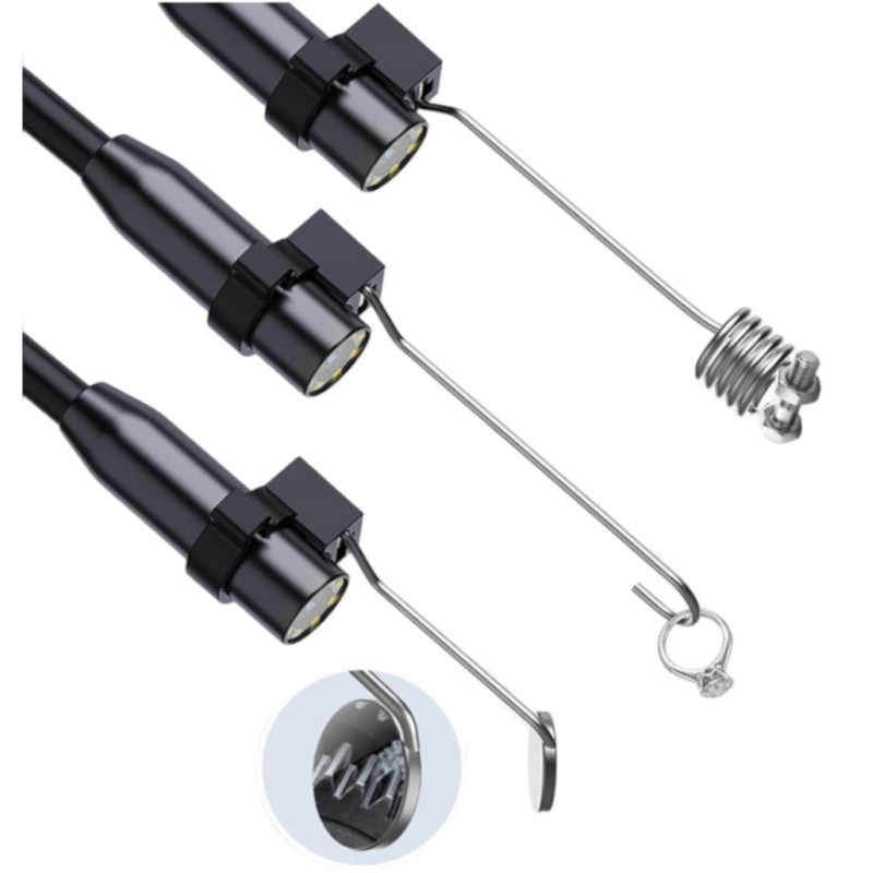 - Wymienne końcówki – hak, magnes oraz lusterko, które zwiększają funkcjonalność urządzenia, ułatwiając wyciąganie małych elementów z trudno dostępnych miejsc.