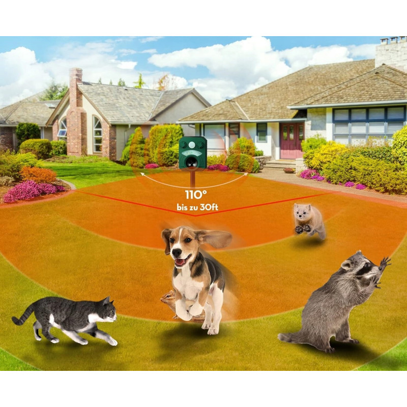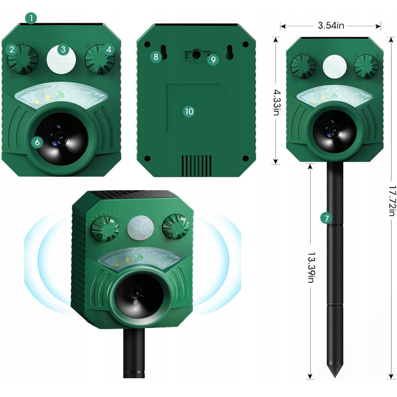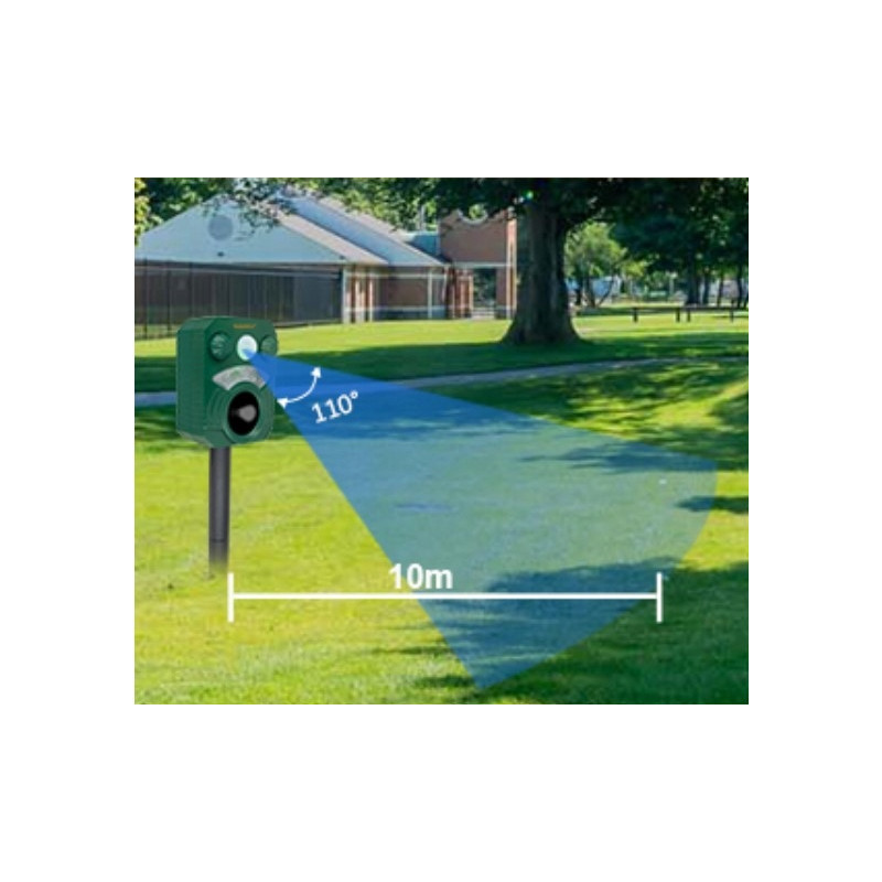 - Łatwa Instalacja i Duży Zasięg: Odstraszacz można łatwo zamontować na ziemi za pomocą dołączonego kołka lub zawiesić na ścianie. Urządzenie pokrywa szeroki kąt 110° i zasięg do 10 metrów, co czyni je idealnym do ochrony dużych powierzchni, takich jak ogrody i podwórka.
