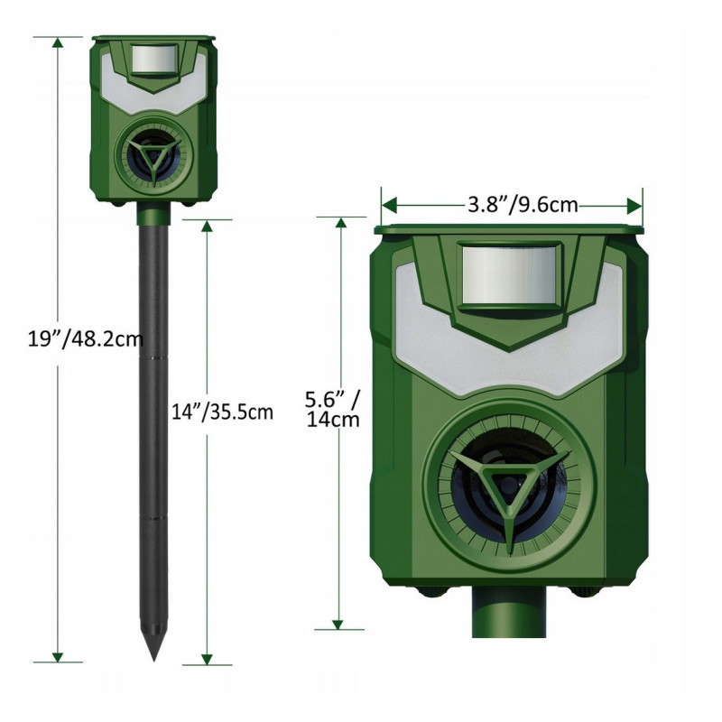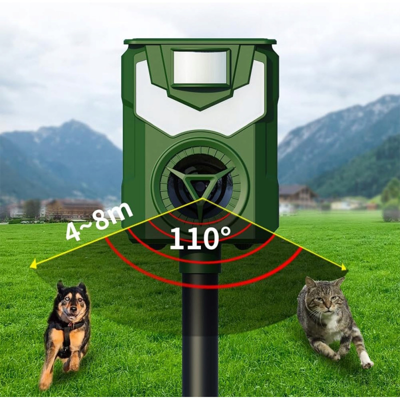 - Ultradźwiękowy Odstraszacz Zwierząt: Wyposażony w zaawansowany czujnik PIR, odstraszacz wykrywa ruch w promieniu 110 stopni oraz na odległość do 8 metrów (26 stóp). Emituje ultradźwięki o częstotliwości od 13,5 do 45 kHz, które skutecznie odstraszają niechciane zwierzęta, takie jak psy, koty, kuny, sarny, jelenie, lisy, zające, bobry i inne.