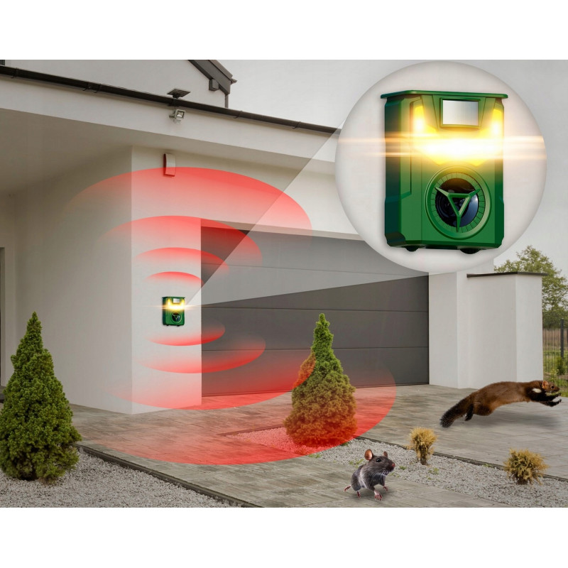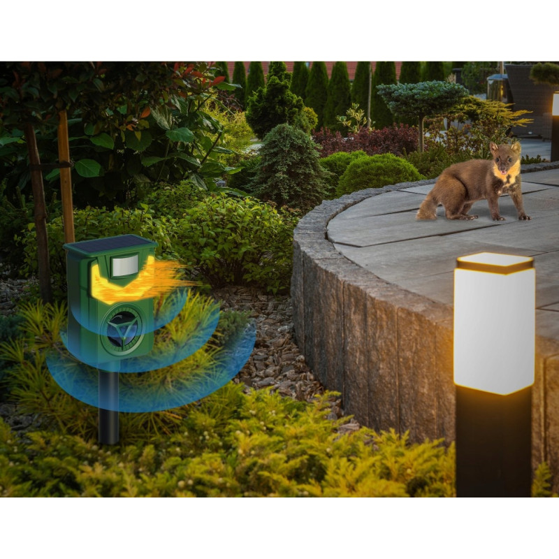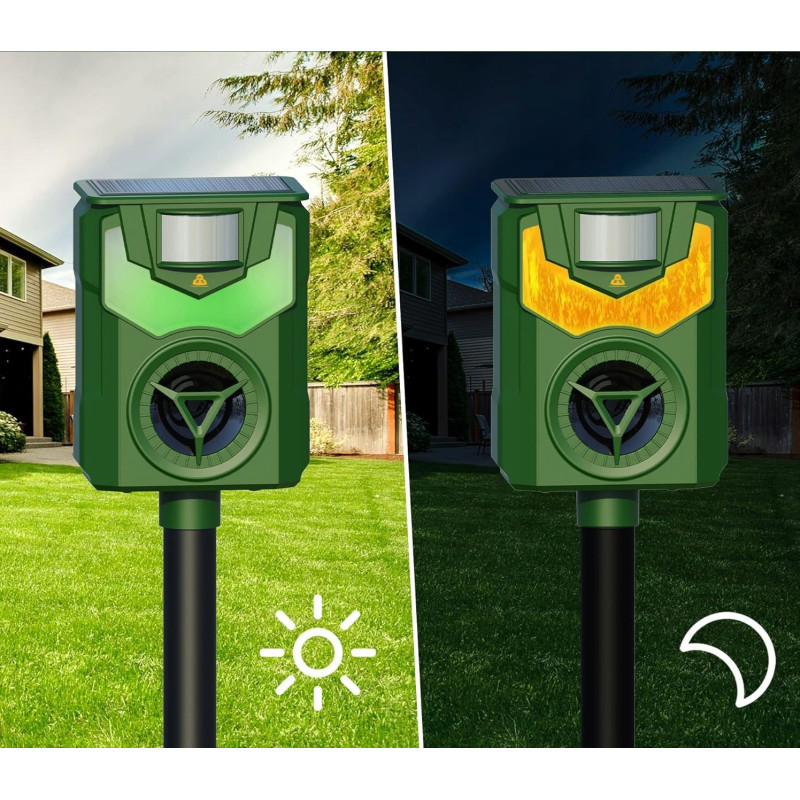 Urządzenie wywołuje ultradźwięki o różnych częstotliwościach. Są one bardzo nieprzyjemne dla zwierząt. Psy i koty mają bardzo dobry słuch, dlatego odczuwają te dźwięki wyjątkowo źle. Odstraszacz świeci również agresywnym światłem w nocy. Zwierzęta go na pewno znienawidzą i będą unikały miejsca, w którym się znajduje.