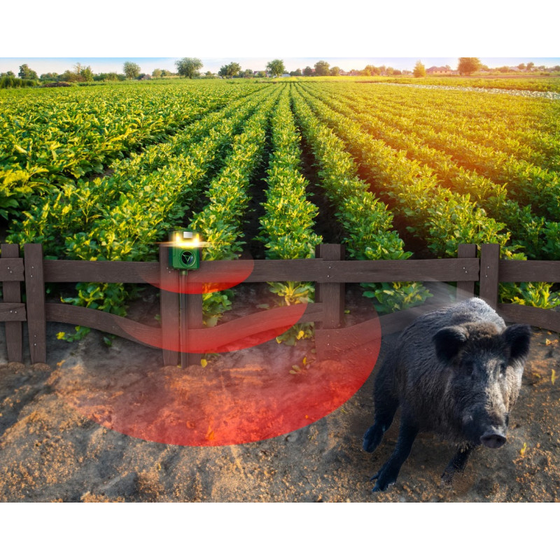 to rozwiązanie skutecznie odstraszające dzikie zwierzęta, łączące w sobie trzy zaawansowane technologie. Nasz odstraszacz wykorzystuje najnowocześniejszą technologię czujnika ruchu PIR, by skutecznie wykrywać zbliżające się zwierzęta i aktywować metody odstraszające, takie jak: