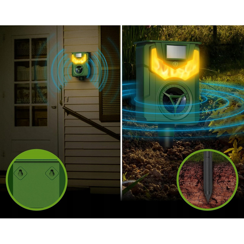 - Unikalny Design z Płomieniami: Odstraszacz został wyposażony w innowacyjny system symulacji płomienia, który działa w nocy. Światła imitujące płomienie uruchamiają się automatycznie po zmroku, dzięki czujnikowi zmierzchu. Ta funkcja zwiększa efektywność odstraszania, ponieważ wiele zwierząt boi się ognia.