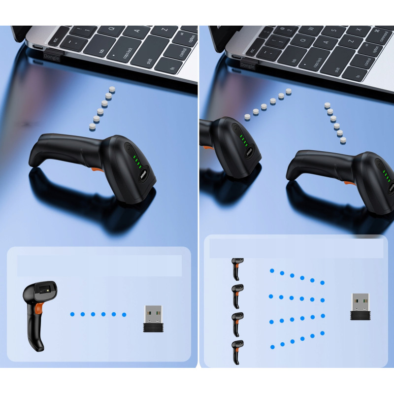 - Wiele skanerów do jednego odbiornika – W tym trybie wiele skanerów może przesyłać dane do jednego odbiornika USB. Jest to idealne w środowiskach takich jak magazyn, gdzie kilka osób może skanować równocześnie, przekazując dane do jednego komputera.