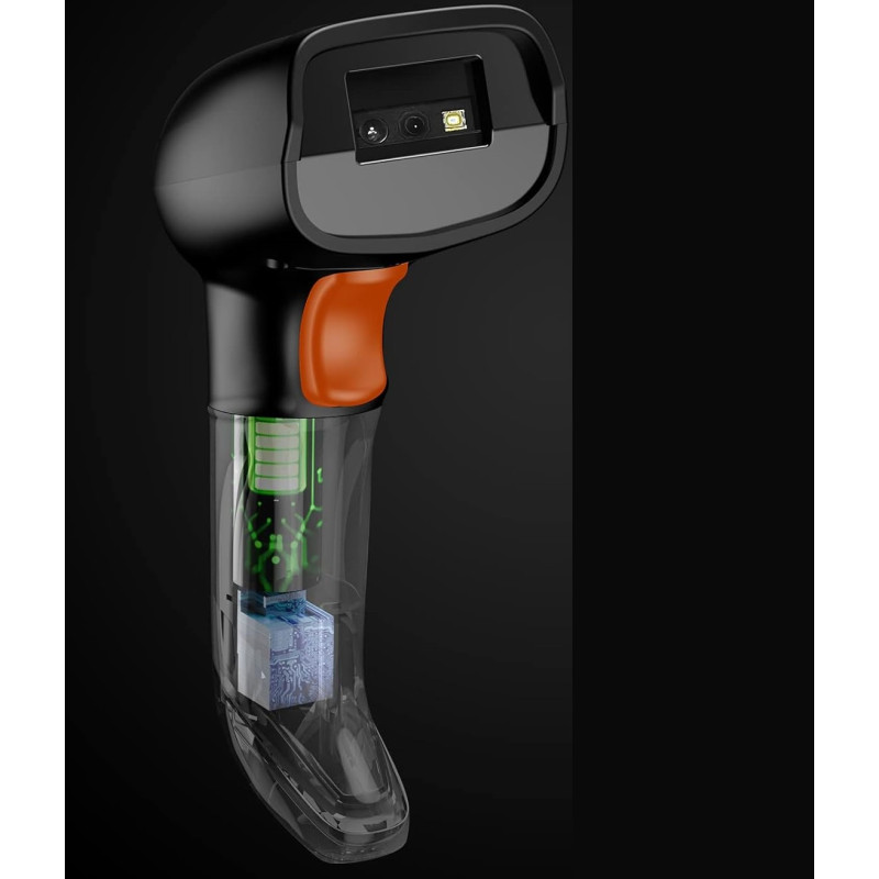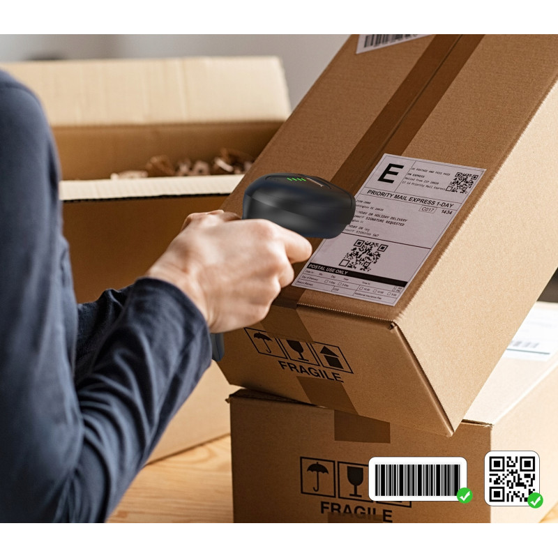 - Bezprzewodowy skaner 2D: Odczytuje kody kreskowe 1D i 2D (QR, DataMatrix, PDF417, Aztec itp.) na etykietach, ekranach telefonów i komputerów.
