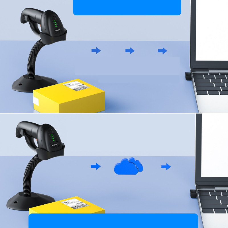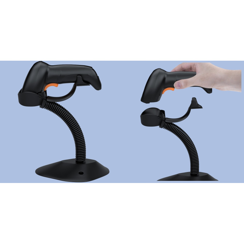 Wystarczy umieścić skaner na stojaku, aby automatycznie przełączyć się na tryb automatycznego wykrywania kodów (auto-sense scanning mode). Dzięki temu nie musisz ręcznie uruchamiać skanowania – urządzenie samo wykryje kod kreskowy i natychmiast go zeskanuje.