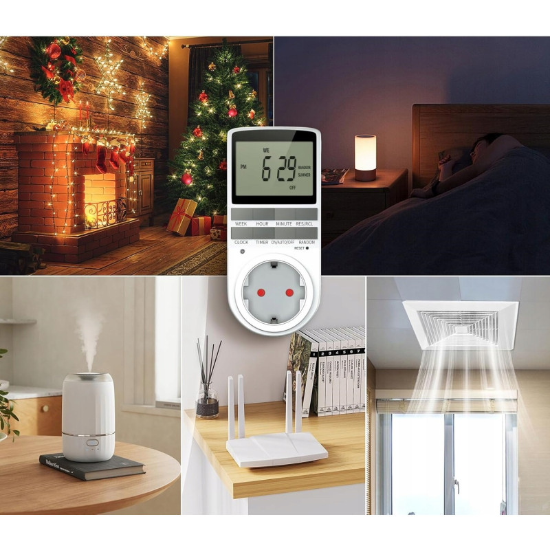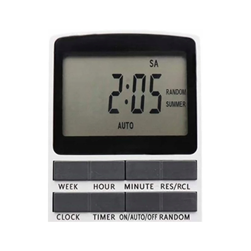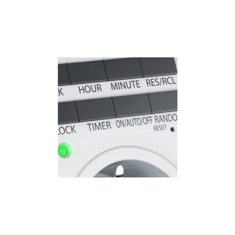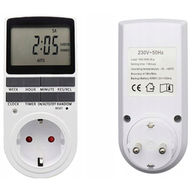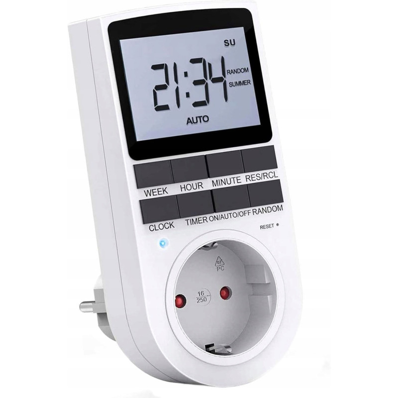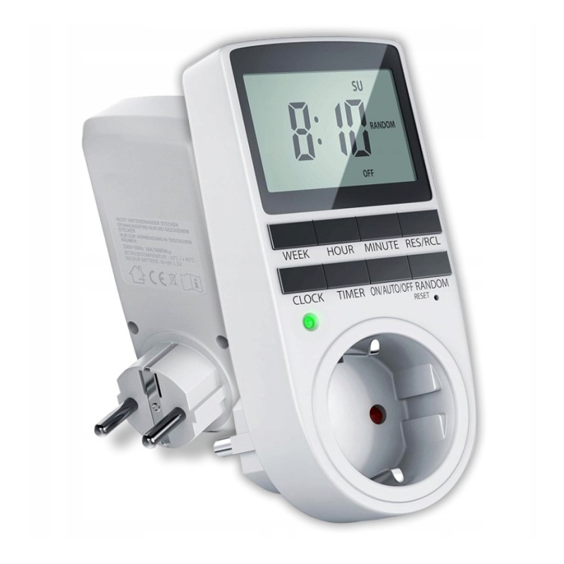 Wyposażony w 8 przycisków do precyzyjnego programowania, możliwość ciągłego włączania/wyłączania lub ustawiania czasu przełączania programów. 10 różnych programów dziennie. Do 16 ustawień łącznie ustawianych w odstępach 1 minuty. Funkcja losowo przełącza się timer na 30 minut w czasie 18:31 i 5:30 w pozycji ON