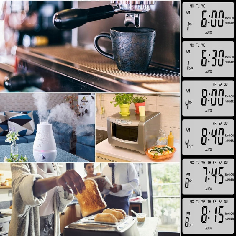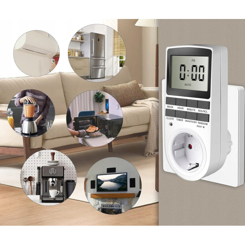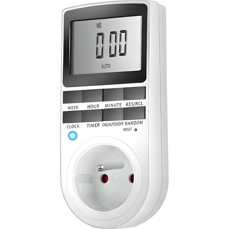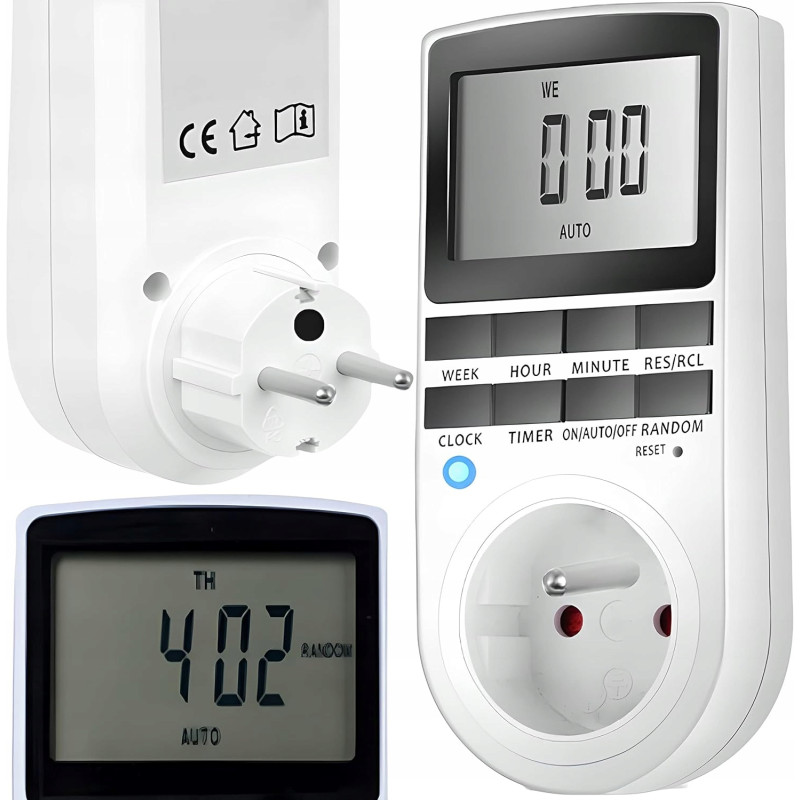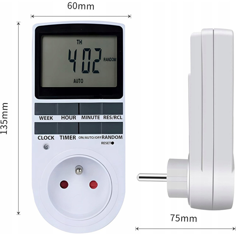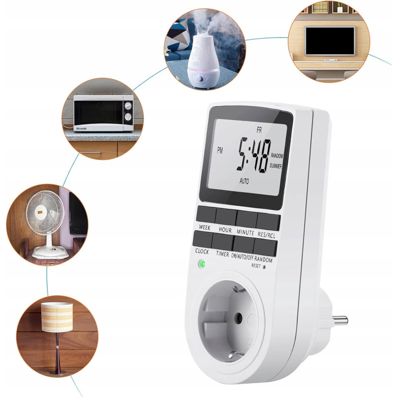 Wyposażony w 8 przycisków do precyzyjnego programowania, możliwość ciągłego włączania/wyłączania lub ustawiania czasu przełączania programów. 10 różnych programów dziennie. Do 16 ustawień łącznie ustawianych w odstępach 1 minuty. Funkcja losowo przełącza się timer na 30 minut w czasie 18:31 i 5:30 w pozycji ON