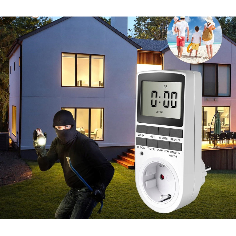 Programator czasowy pomoże nam zarządzać oświetleniem, ponieważ możemy ustawić go z tygodniowym wyprzedzeniem lub w trybie losowym, tak aby lampa działała o różnych porach dnia i nocy, a tym samym odstrasza obcych i chroni nasz dom przed włamaniem i kradzieżą. Zegar czasowy posiada uziemienie, które chroni nasze urządzenia przed szkodliwymi skutkami wyładowań atmosferycznych.