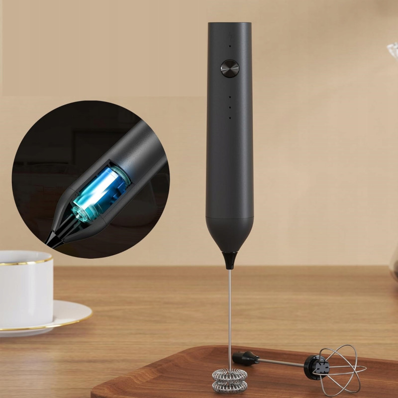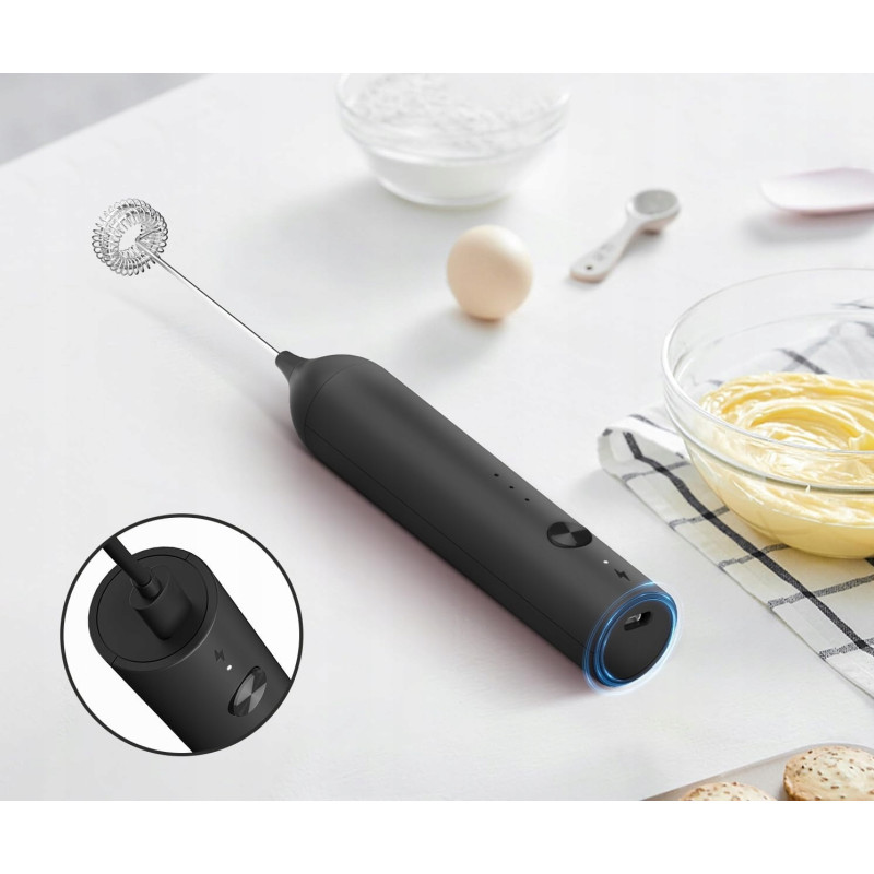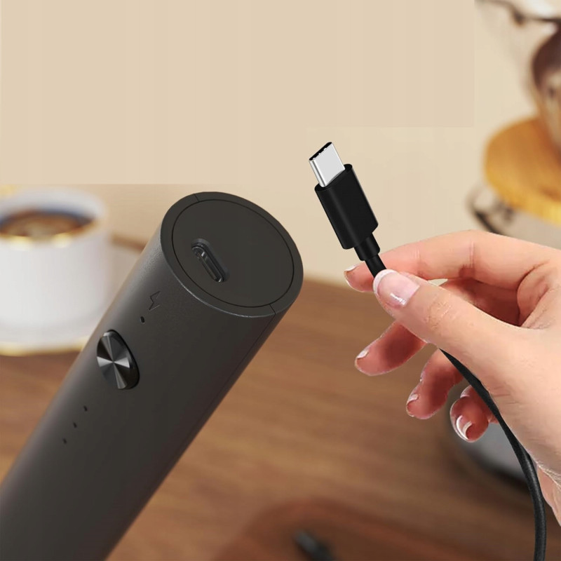 Jest to ładowalny spieniacz do mleka, wydajna bateria 1200 mAh, ładowanie za pomocą kabla USB typu c.