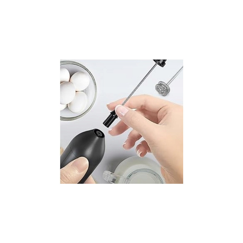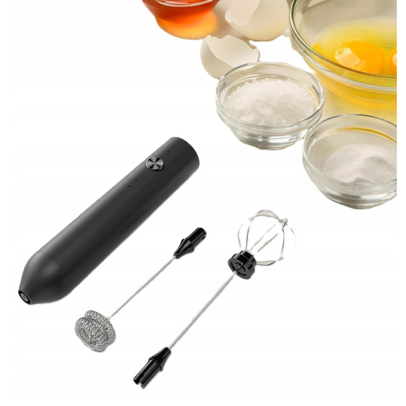 - Dwa wymienne trzepaczki – zestaw zawiera podwójne mieszadło do spieniania mleka oraz głowicę balonową do ubijania jajek lub bitej śmietany. Obie końcówki są wykonane z wysokiej jakości stali nierdzewnej 304, bezpiecznej dla żywności i łatwej do czyszczenia.