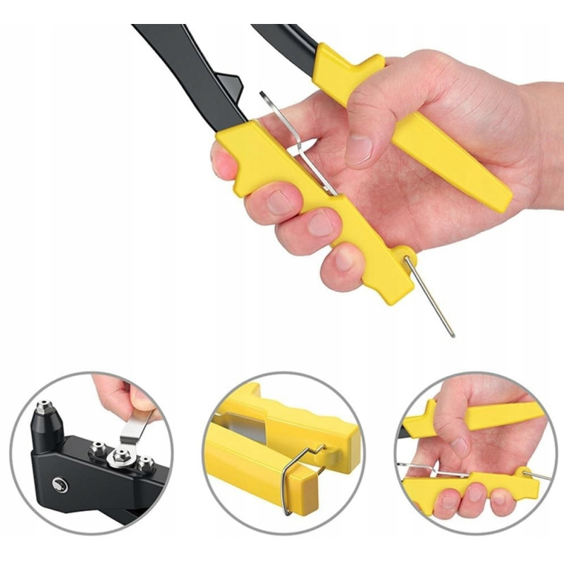 - Zakończenie: Po zaciągnięciu nitu, zwolnij rączki. Odpadowa część trzpienia wypadnie automatycznie.