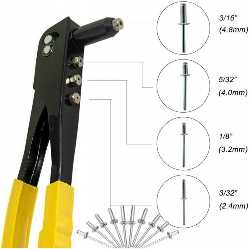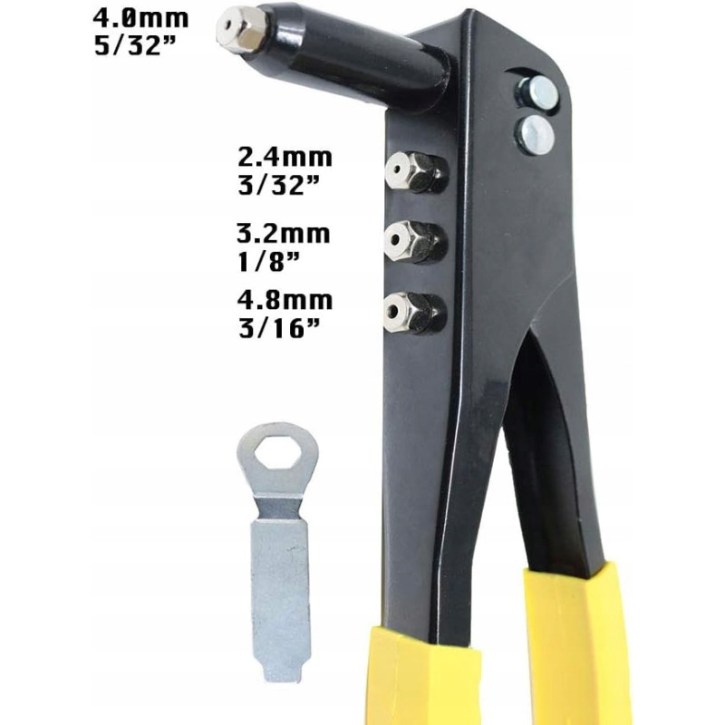 - Zakres średnic nitów: 2,4 mm, 3,2 mm, 4,0 mm, 4,8 mm – standardowe wymiary pozwalają na szerokie zastosowanie narzędzia w różnych projektach.