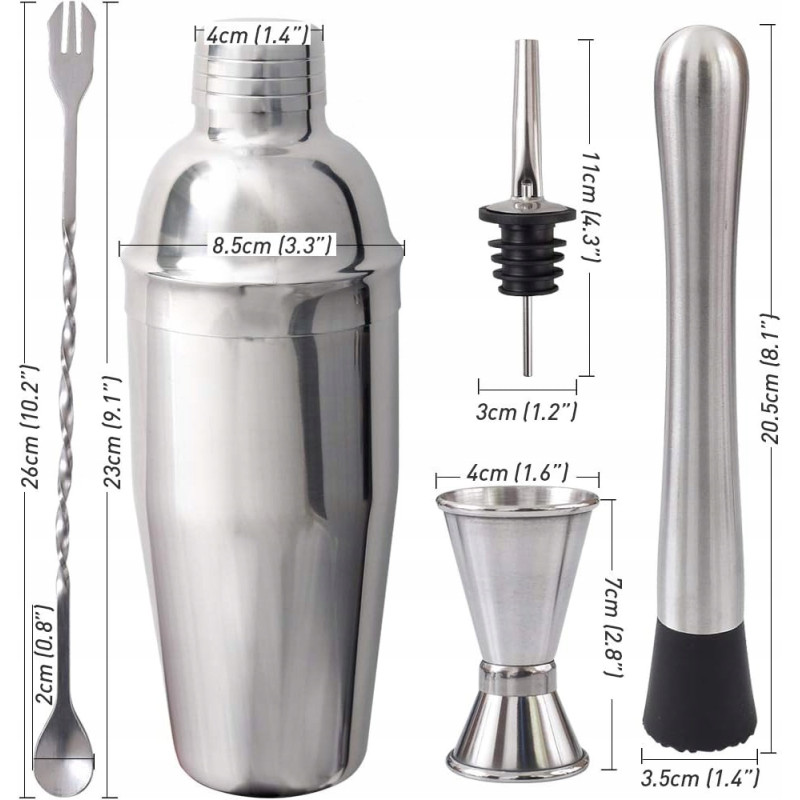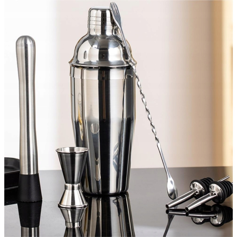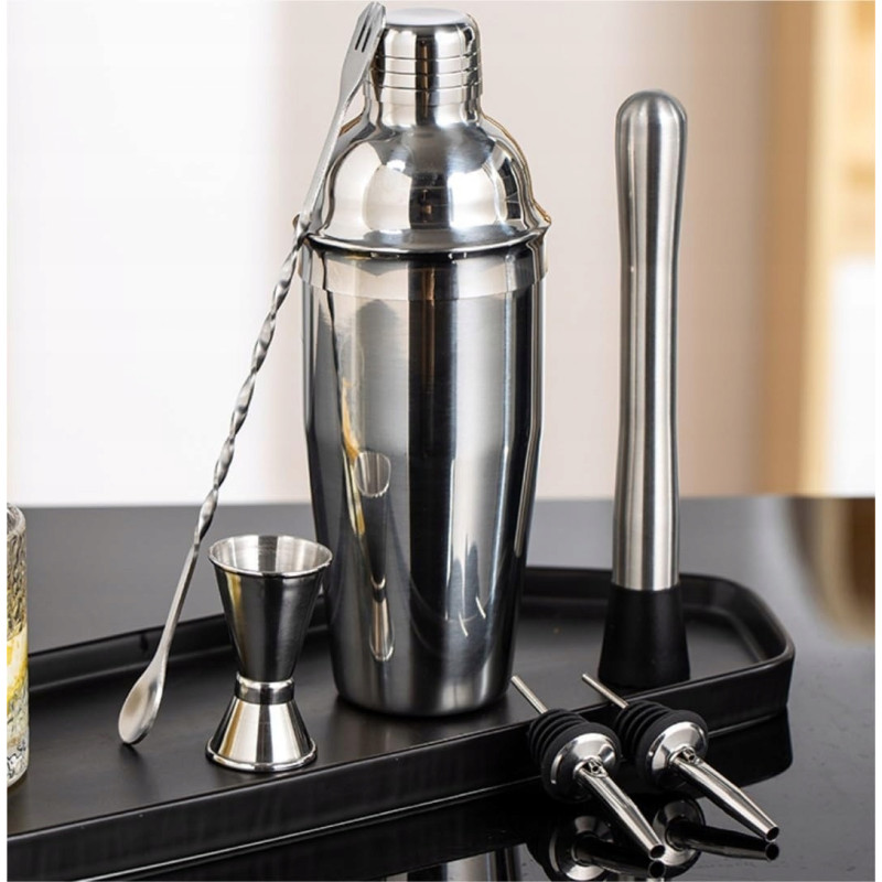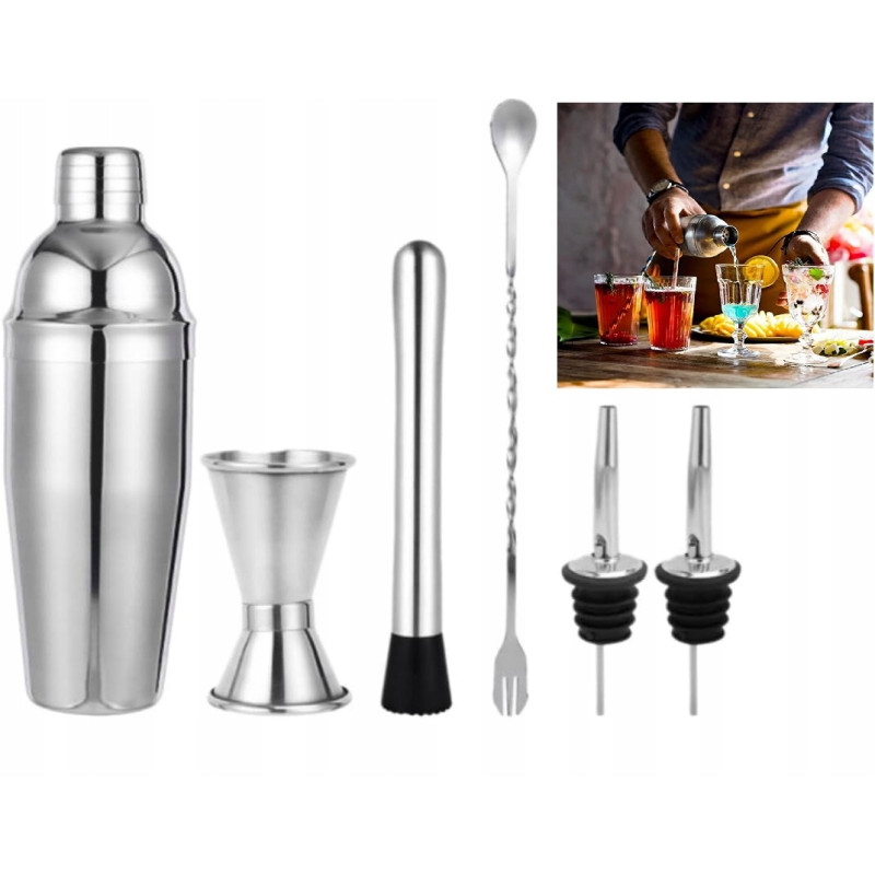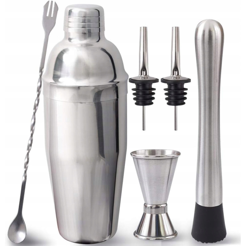 - Kompletny zestaw 7w1: Shaker (750 ml), miarka (15/30 ml), łyżka barowa, muddler, oraz dwie nalewki. Idealny zarówno dla początkujących, jak i doświadczonych barmanów.