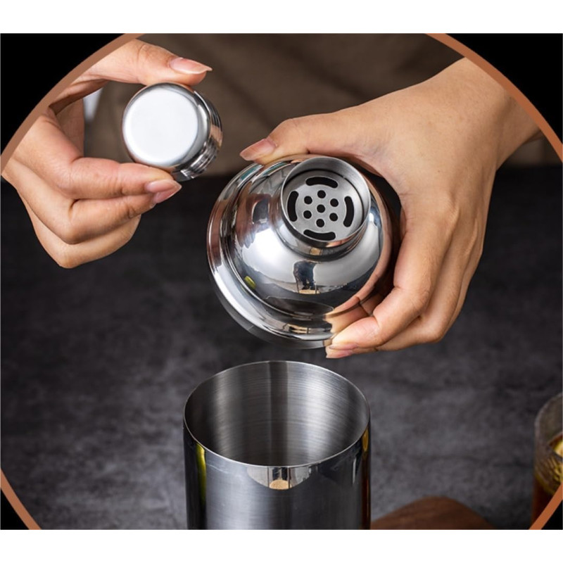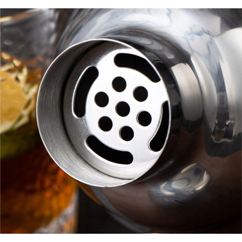- Shaker koktajlowy (2 części) – główny element zestawu o pojemności 750 ml, wykonany ze stali nierdzewnej, idealny do mieszania drinków i koktajli. Posiada wbudowane sitko, które ułatwia przecedzanie składników stałych.