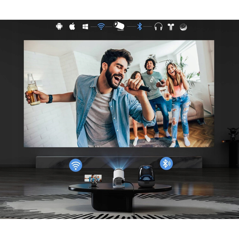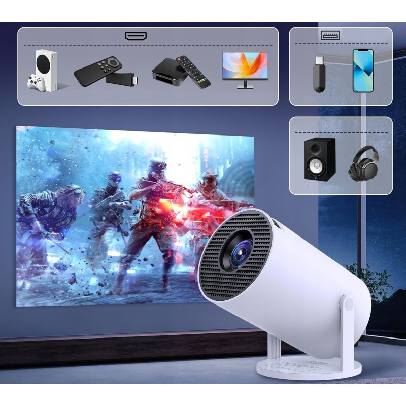- Smart TV: Urządzenie działa jako pełnoprawny smart TV, z wbudowanym systemem operacyjnym Android, co umożliwia korzystanie z aplikacji takich jak YouTube, Netflix, czy Prime Video bezpośrednio na projektorze.