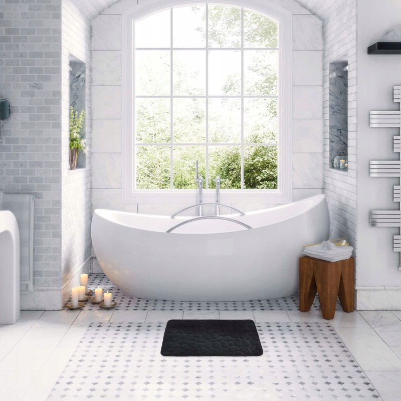 - Nowoczesny design 3D: Wyjątkowy wzór w kształcie kamieni sprawia, że dywanik staje się również ozdobą każdej łazienki.