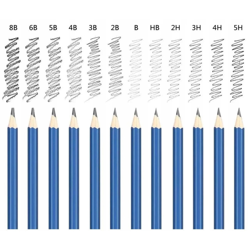 - 12 ołówków grafitowych o twardościach: 2H, 3H, 4H, 5H, HB, B, 2B, 3B, 4B, 5B, 6B, 8B.