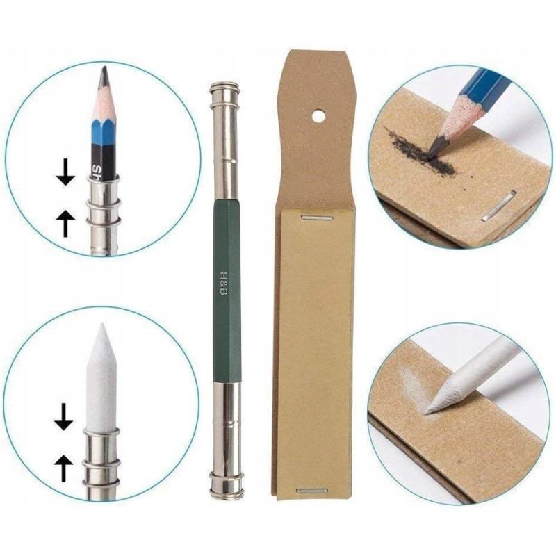 Przedłużacz ołówka pozwala na komfortowe użytkowanie krótkich ołówków, zwiększając ich długość. Blok ścierny umożliwia wygodne ostrzenie wiszerów oraz ołówków pod dowolnym kątem, co ułatwia precyzyjne szkicowanie i cieniowanie.