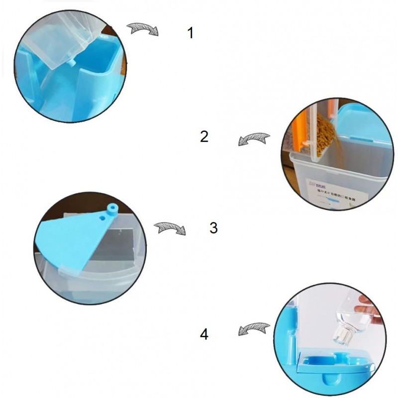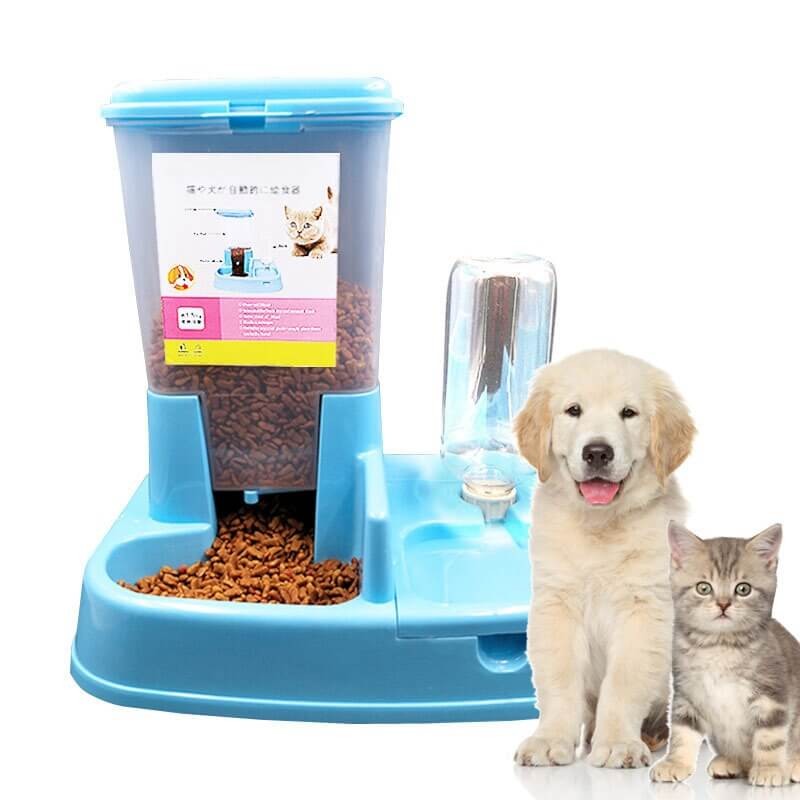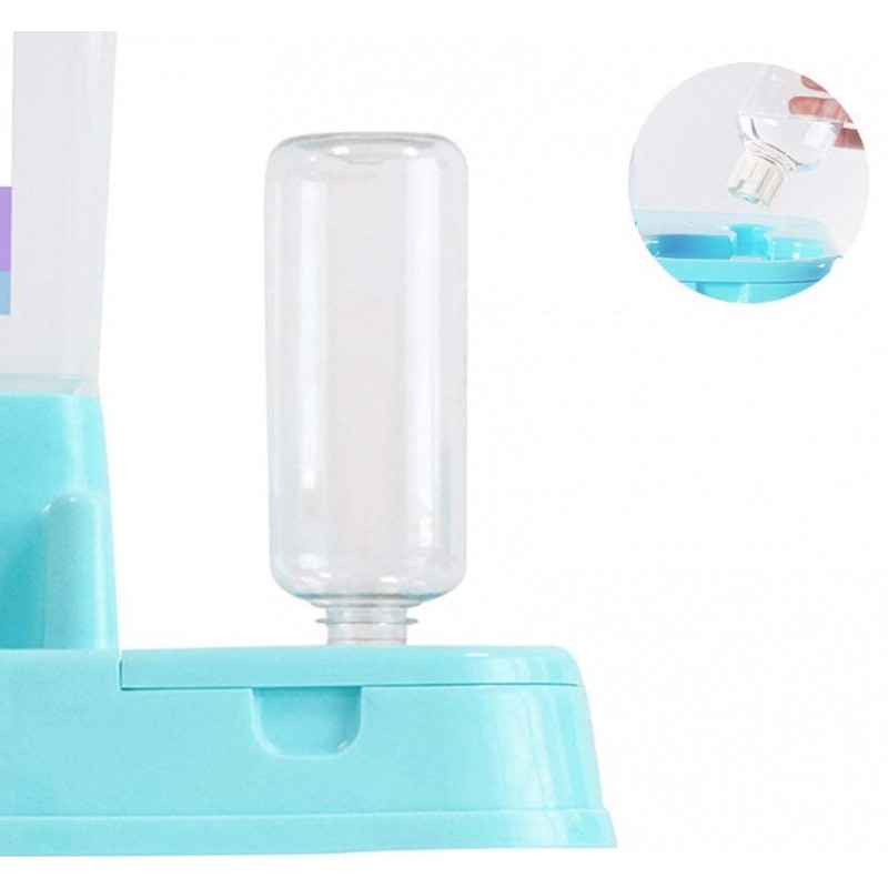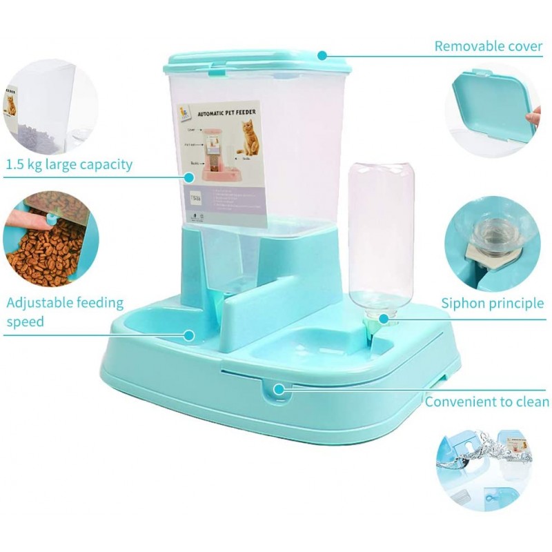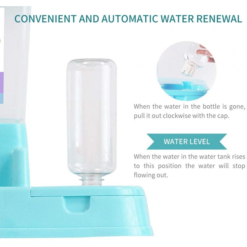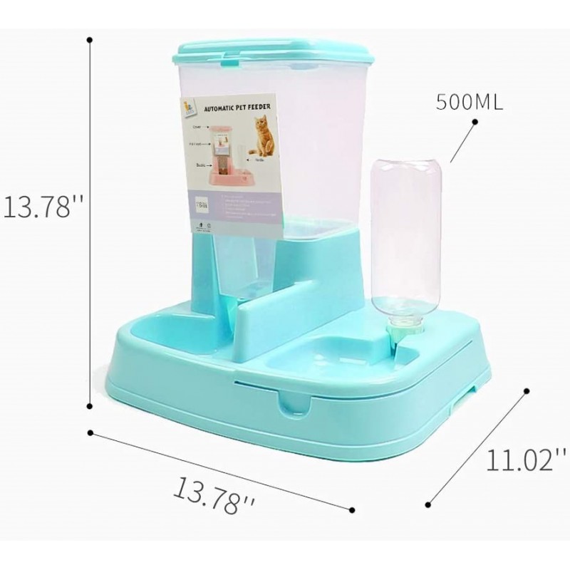 Automatyczny podajnik karmy i wody dla zwierząt domowych zawiera butelkę na wodę i puszkę na karmę. Zaspokaja potrzeby żywieniowe zwierząt domowych przez kilka dni, gdy nie ma Cię w domu.