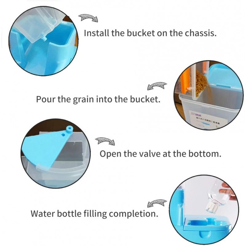Pojemnik na żywność o dużej pojemności: Dozownik żywności wykorzystuje zasadę zasilania grawitacyjnego, nie wymaga prądu, może być używany w dowolnym miejscu. Na dole pojemnika na karmę znajduje się przełącznik, który kontroluje prędkość i objętość suchej karmy i łatwo rozwiązuje problem karmienia.