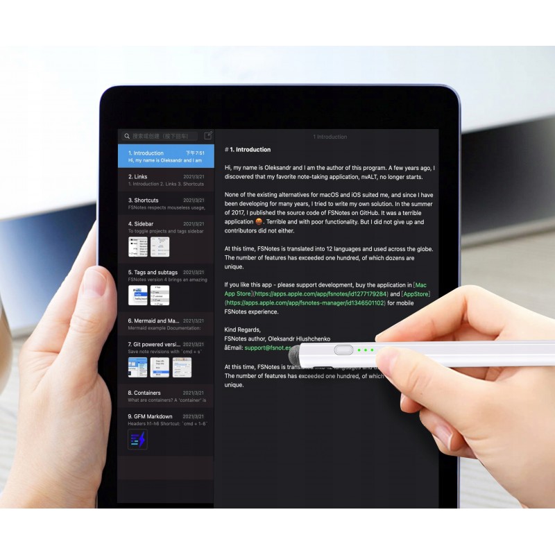 - Palm Rejection - Swobodnie korzystaj z rysika dotykając dłonią ekranu. Palm Rejection umożliwia wygodne umieszczenie dłoni na ekranie podczas pisania lub rysowania przy użyciu tego rysika na iPadzie bez wpływu na użytkowanie. Nie martw się o przeszkadzające oznakowanie. Nie wymaga rękawic. Zapewnia naturalne uczucie pisania i szybką, bezproblemową interakcję z Twoim ekranem.