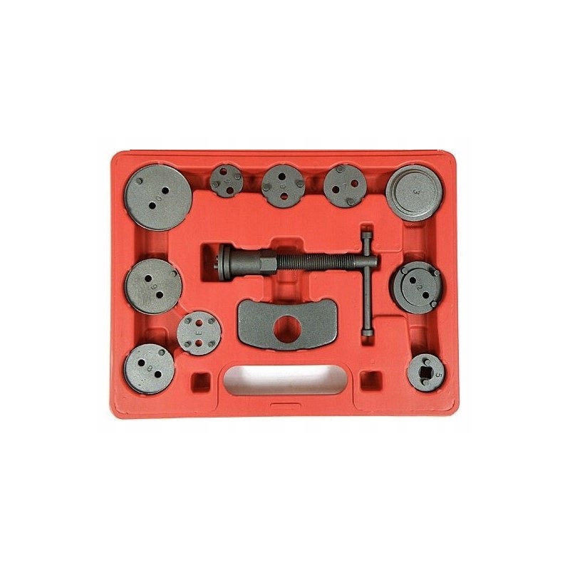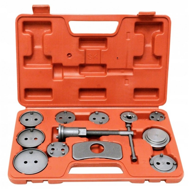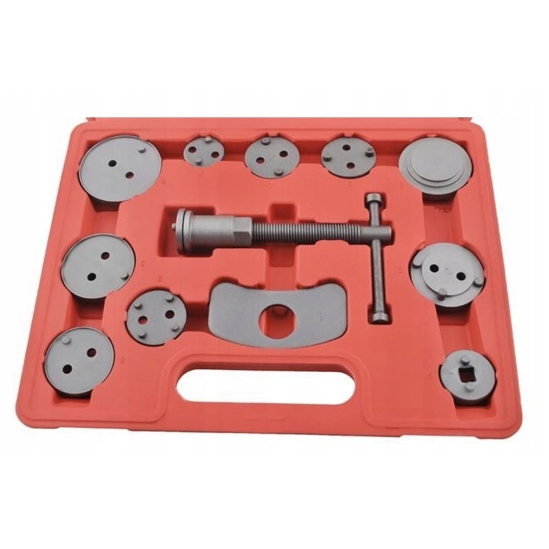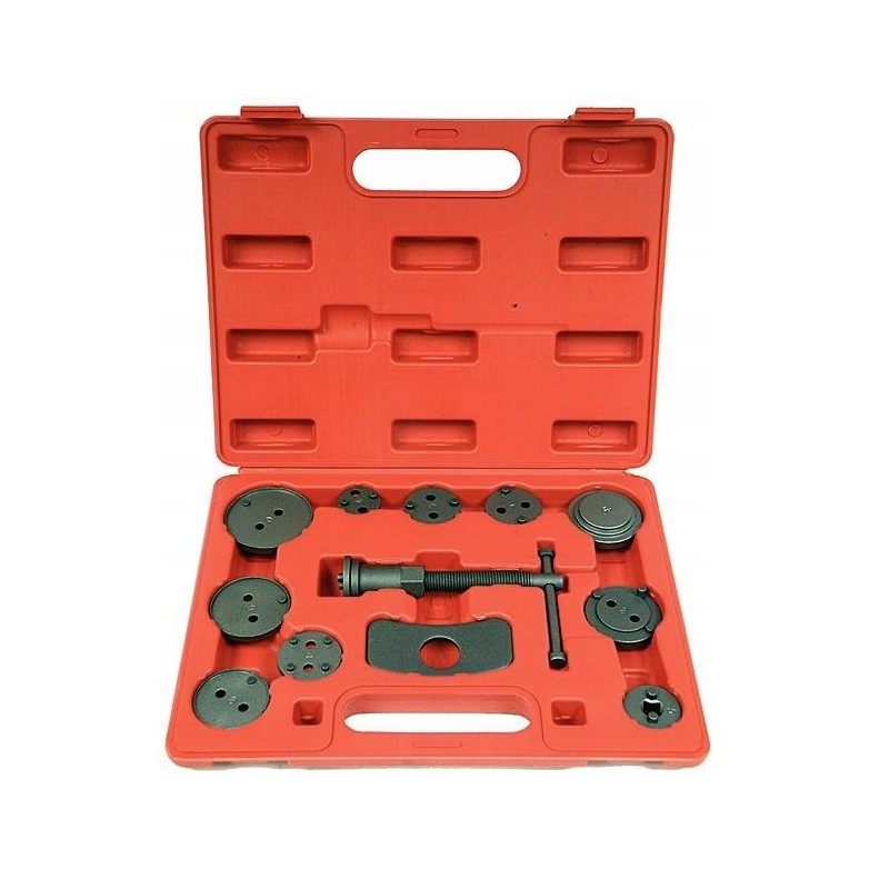 W zestawie znajdują się praska prawo skrętna. Zestaw pasuje do większości aut na rynku. Całość zapakowana jest w plastikową walizkę. Zestaw wykonany z najwyższej wysokiej jakości stali, zapakowany w solidną plastikową walizkę. Pokrętło wyposażone w magnetyczną końcówkę utrzymującą każdy adapter Doskonale sprawdza się przy pracy z tłoczkami ceramicznymi. Zestaw przeznaczony jest dla każdego warsztatu samochodowego, gdzie pomaga przyspieszyć serwisowanie układów hamulcowych. Zestaw 12 elementowy do cofania / wyciskania tłoczków w cylinderkach układów hamulcowych, niezbędny przy naprawach pojazdów wyposażonych w hamulce tarczowe.