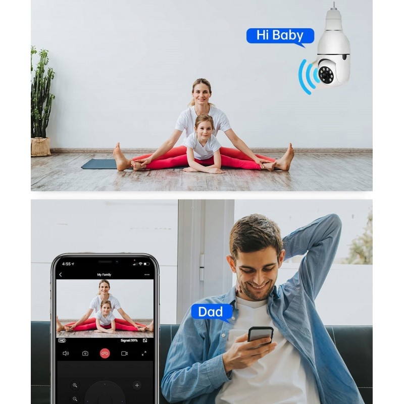 Żarówka posiada klasyczny gwint E27, co umożliwia jej prostą instalację w praktycznie każdym pomieszczeniu. Kamera wymaga stałego zasilania 230 V. Dlatego należy wkręcić ja do gwintu na żarówkę.