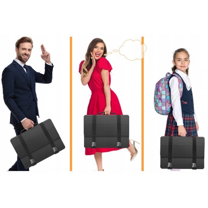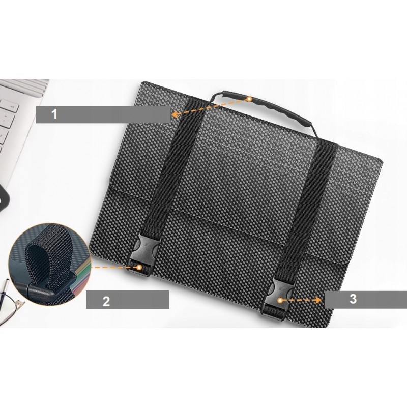 Bezpieczne zamknięcie teczki - pełnowymiarowa, elastyczna klapa teczki i 2 zapięcia, zapewniają pełne bezpieczeństwo. Aby uzyskać dostęp do przechowywanych przedmiotów, wystarczy " kliknąć" zatrzaski.