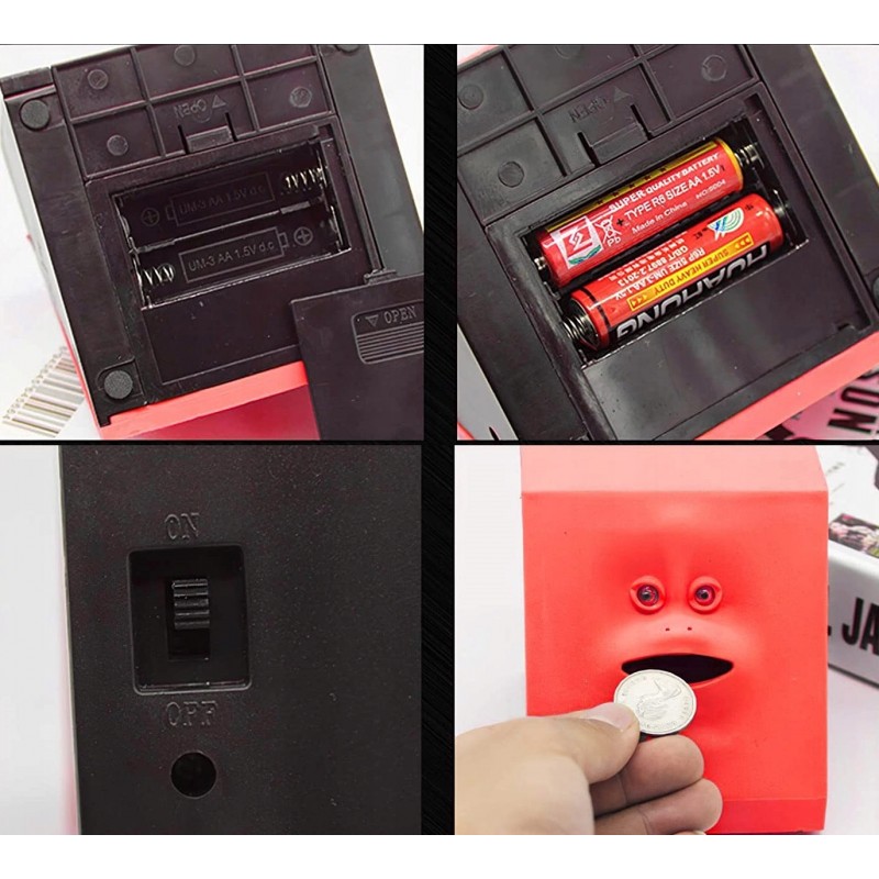 Pod ustami wbudowany jest sensor, który reaguje na zbliżającą się dłoń i skarbonka otwiera usta, aby można było wsunąć pieniążek.