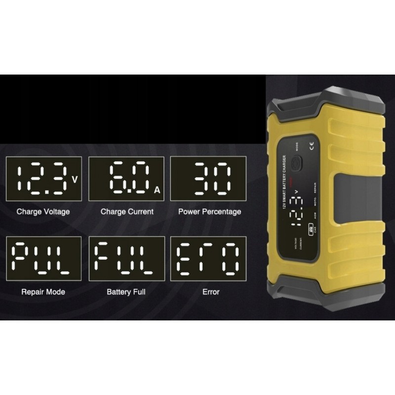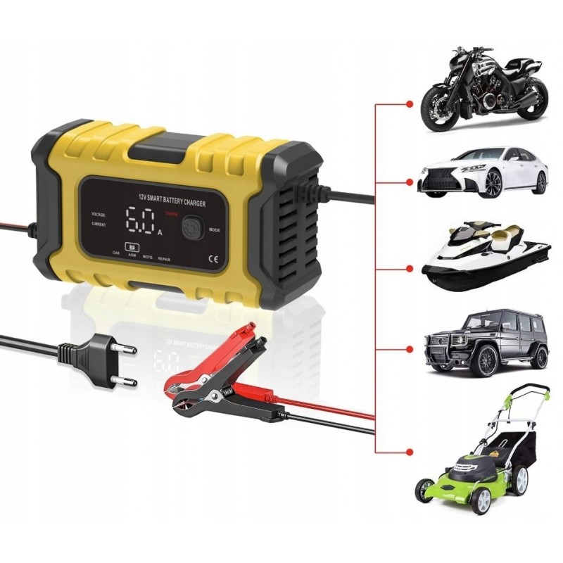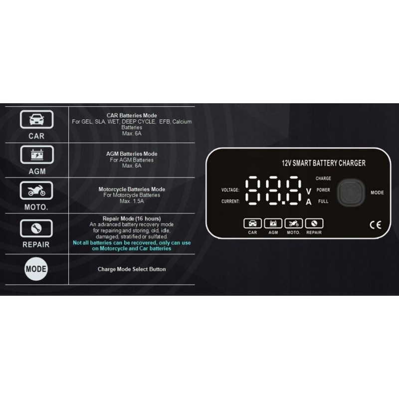 Nadaje się zarówno do akumulatorów 12 V, działa z SLA, WET, MF, FLOODED, GEL, VRLA, AGM, EFB, co oznacza, że może być stosowany do akumulatorów w samochodach, motocyklach, łodziach, kosiarkach, pojazdach rolniczych i innych.