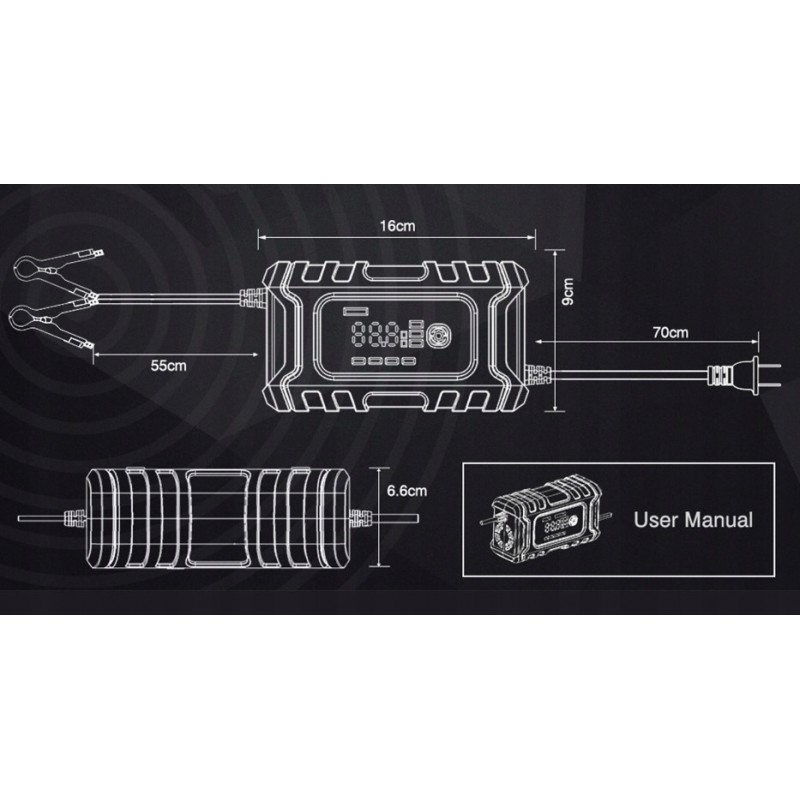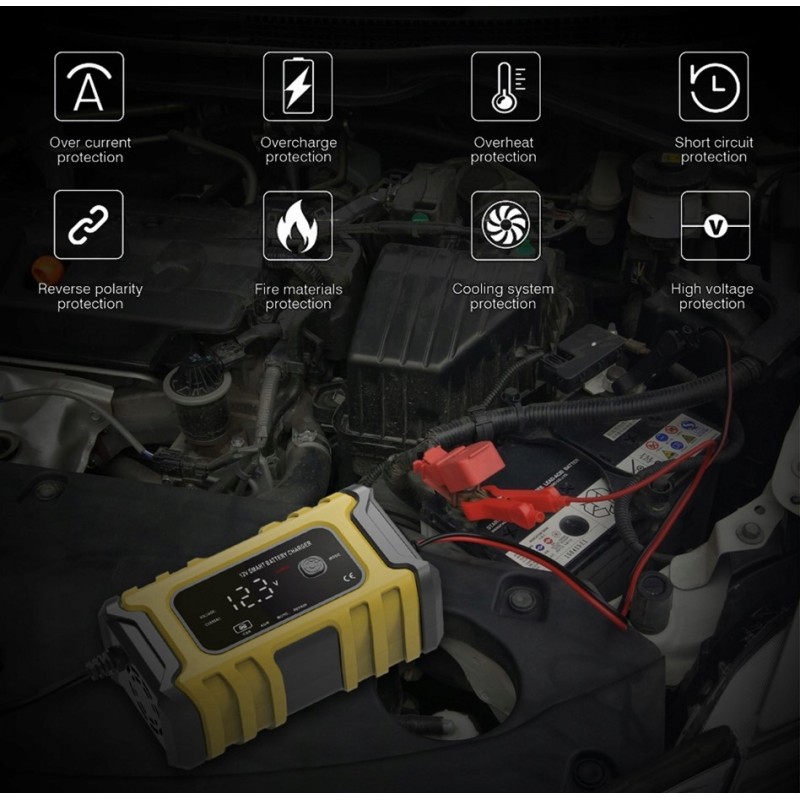 Ładowarka akumulatorów zapewnia ochronę przed odwrotną polaryzacją, zwarciem, przepięciem, niskim napięciem, przetężeniem i przegrzaniem, sprzężeniem zwrotnym, przed porażeniem elektrycznym ( w pełni owinięte zaciski krokodylowe są solidne i bezpieczne w użyciu).