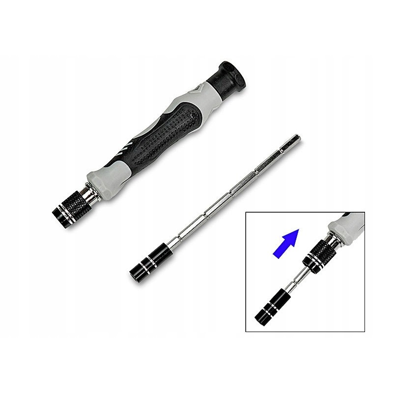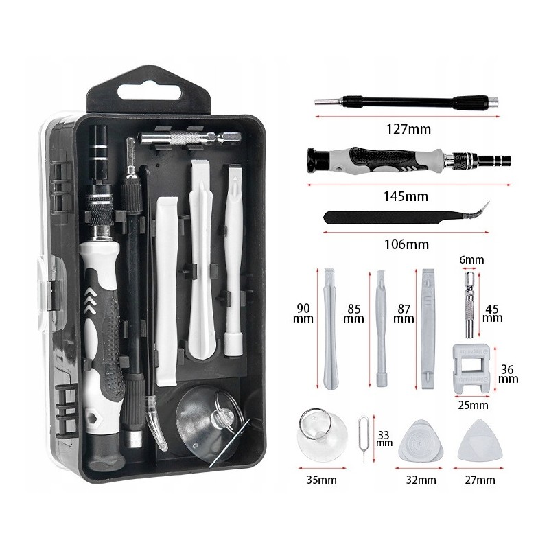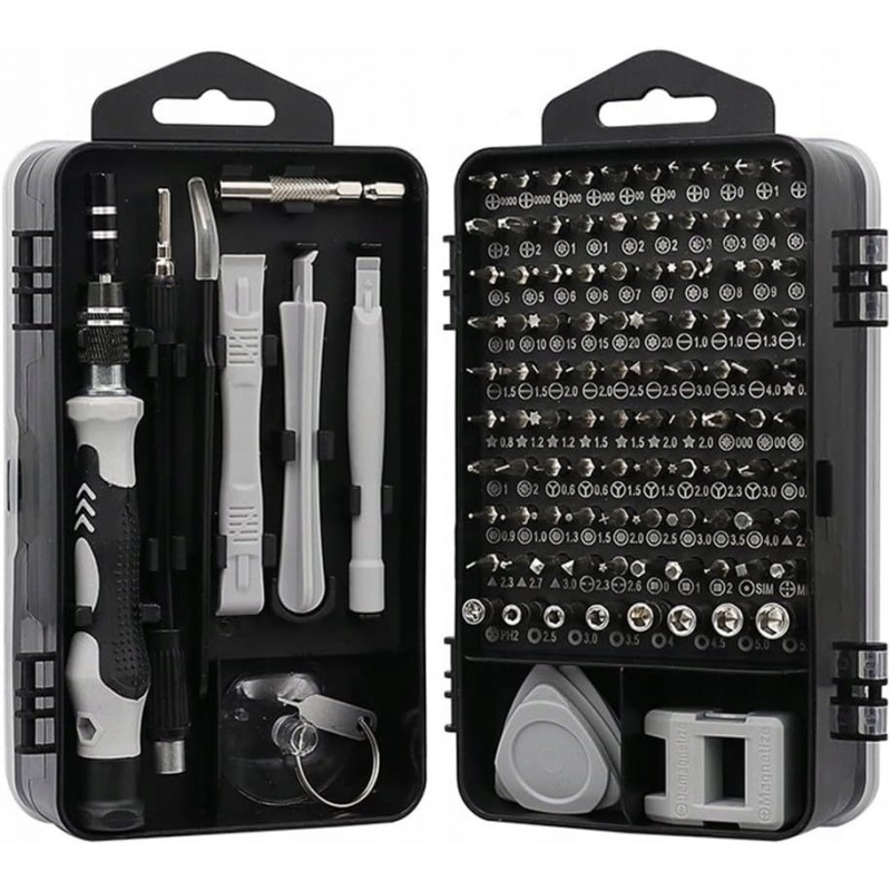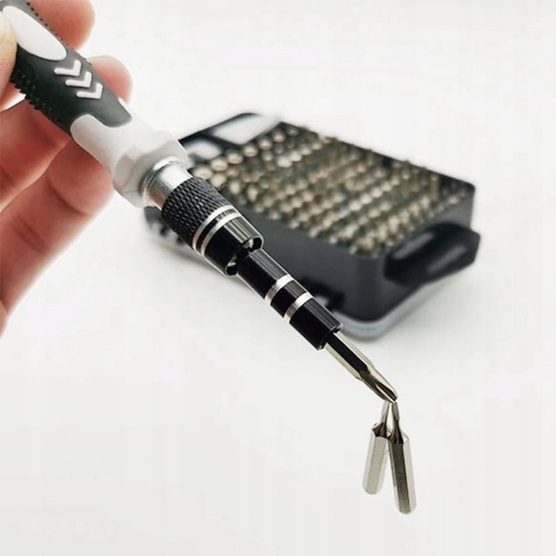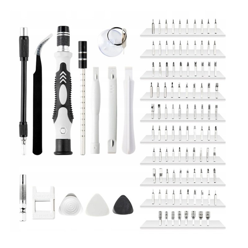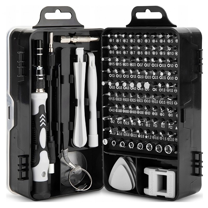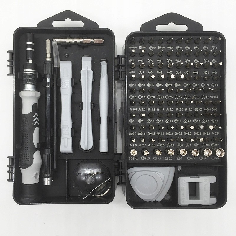 Komplet został wyposażony w aż 115 elementów, co pozwoli Tobie na wykonywanie profesjonalnych napraw. W zestawie znajdują się niezbędne narzędzia oraz duża ilość wkrętaków, które pomogą tobie podczas majsterkowania. Zestaw składa się z narzędzia głównego, czyli uchwytu- bazy do wkrętaków, a także, aż z 98 końcówek w różnym rozmiarze i kształcie. Akcesorium zawiera dodatkowo otwieraki do obudów oraz magnetyzer/ demagnetyzer do nasadek oraz wiele innych przyborów.
