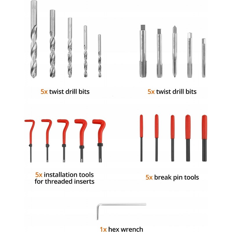 - Wszechstronność: Zestaw zawiera narzędzia do naprawy gwintów o różnych rozmiarach, od M5 do M12, co sprawia, że jest niezwykle uniwersalny.