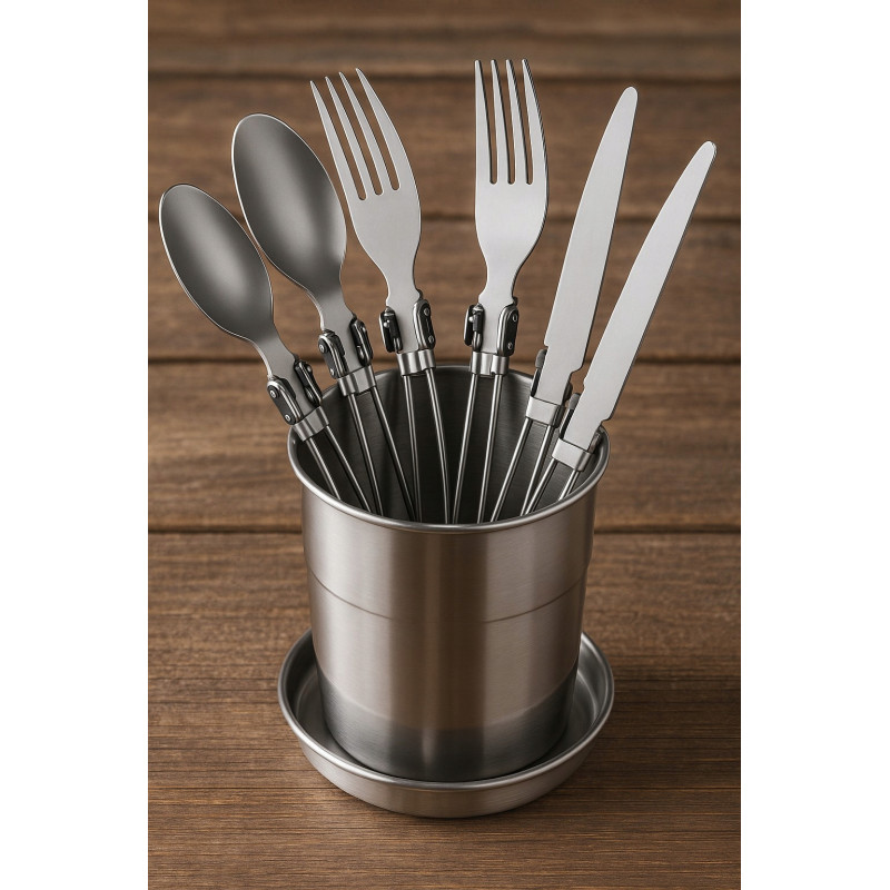 - Sztućce i kubki wykonane ze stopu stali nierdzewnej 304