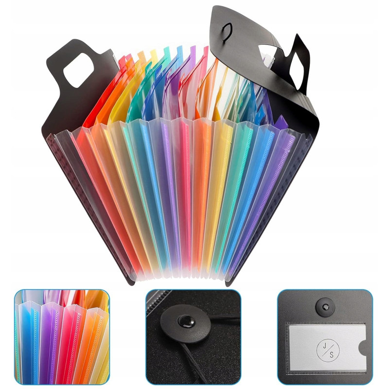 Pojemna, praktyczna i nowoczesna teczka na dokumenty z uchwytem to idealne rozwiązanie do biura, szkoły, domu czy podróży. Dzięki 13 elastycznym przegródkom oraz kolorowym etykietom umożliwia szybkie segregowanie dokumentów, rachunków, notatek i ważnych papierów. Wygodny uchwyt sprawia, że możesz ją nosić jak aktówkę, a elastyczna gumka z klipsem chroni zawartość przed wypadnięciem.