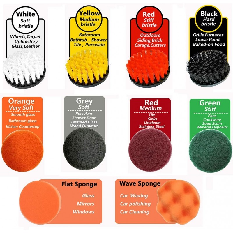 Każda szczotka / gąbka charakteryzuje się inną twardością i grubością, przez co jest przeznaczone do czyszczenia innego rodzaju powierzchni.